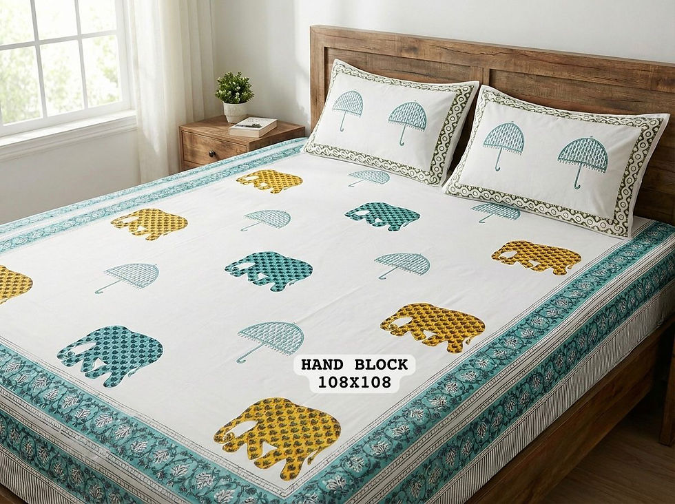 Pure Hand Block Super King Size Cotton Bedsheet-2 Zipped Reversable Pillow Cover